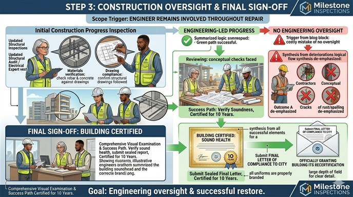 This is where many associations make a costly mistake: they let the contractor work without engineering oversight. During a major 40 year recertification repair, your structural engineer must remain involved. The engineer will perform periodic progress inspections to verify that the contractor is actually using the correct materials and following the structural drawings.